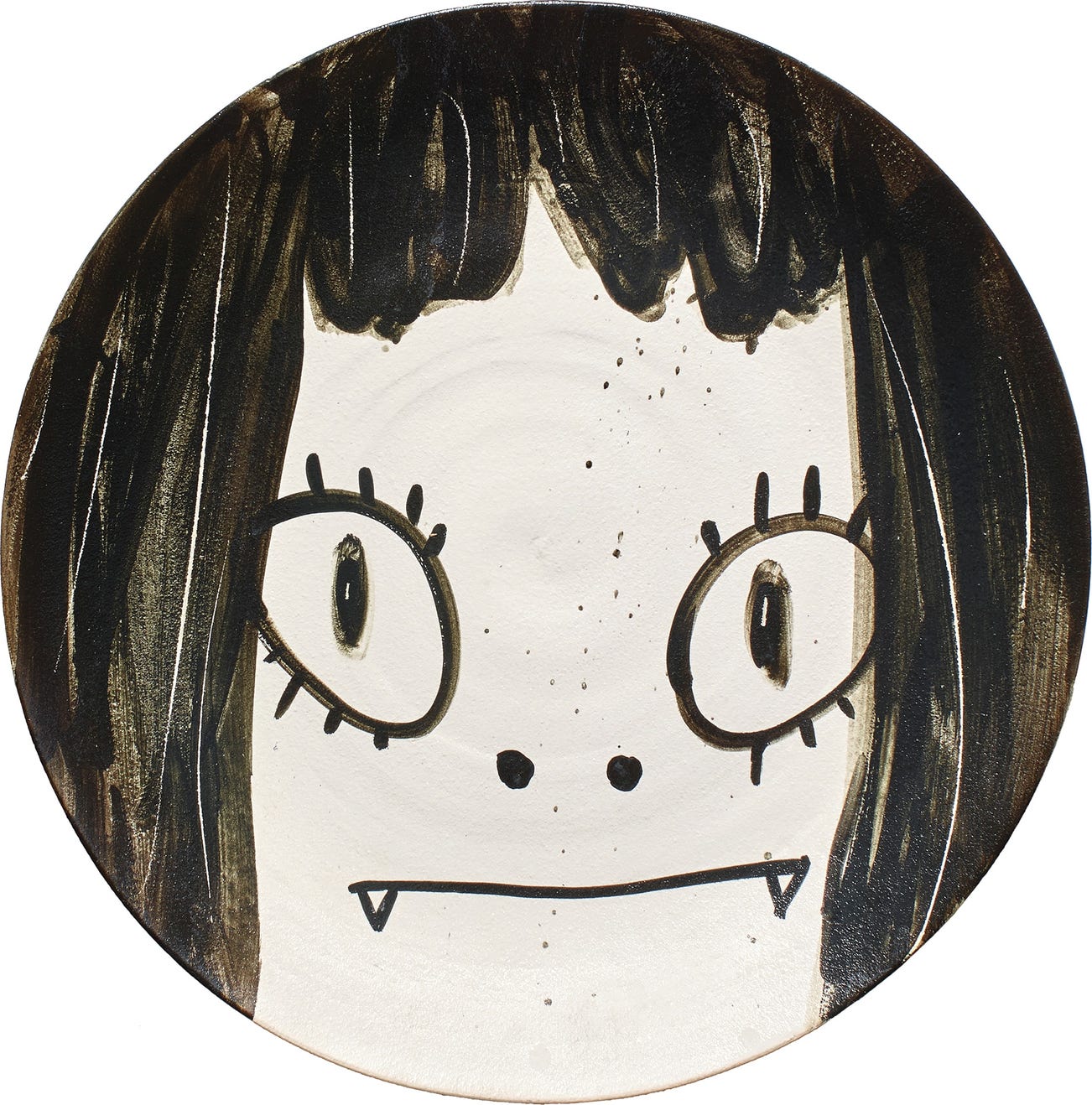 Created ten years prior to Nara’s retrospective at the Toyota Municipal Museum of Art, Aichi, Nara’s craftsmanship was recently celebrated at his 2018 exhibition at Pace gallery’s inaugural Hong Kong space, offering an insight into his recent ceramic output. In the same way that the inside concave plane of the plate in the present work is wholly covered by the face of Nara’s young girl, so his recent sculptures showcase monumental ceramic heads, displaying only the visage and, often exaggerated, heads of his fictional characters. All-consuming and grand in scale, Nara’s new ceramic works engulf us, subsuming the viewer into his complete celebration of the medium. Fascinated by clay’s malleable properties, Nara’s absorption into his ceramic practice is evident, whether sculpting the clay into a figurative realisation of his character or using glaze to paint the outline of its manga-like face. Nara’s work celebrates the ancient properties of these organic materials, unveiling the skill necessary to produce hand painted plates and to hand build with clay, his large heads remindful of Haniwa warriors from the Kofun period. Consumed by the intuitive properties of crafting from clay, Nara asserts ‘I couldn’t make pictures on a blank canvas, but I found I could confront a mass of clay, I wouldn’t think about it with my mind. I would just attack it, like in sumo, with my body’ (Edan Corkill, ‘Yoshitomo Nara puts the heart back in art’, The Japan Times, 20 July 2012, online).