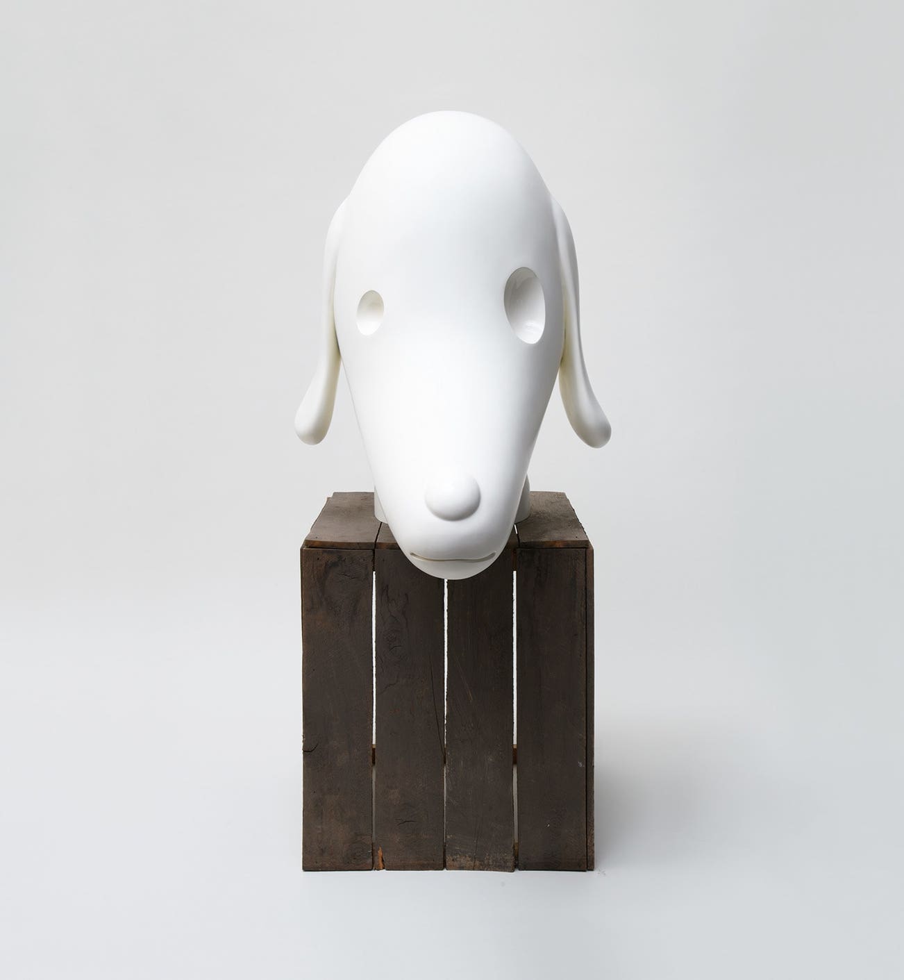 The giant scale puppy head rendered in pure white brings to mind the komainu from the Japanese tradition, mythical lion-dog statues commonly placed at shrine entrances as guardians. Dignified and imposing in solidity and size, Nara introduces emotional complexity to what is commonly viewed as a noble statue. Unlike humans, animals do not have the ability to communicate through words, doing so instead through their expressions. Whilst large and solid, the domesticated canine companion’s playful expression is betrayed by long drooping ears that evoke the fragile vulnerability of a wounded puppy, even conveying a sense of defensive anxiety in response to its surroundings. The result is a larger than life work that is both endearing yet faintly menacing.
