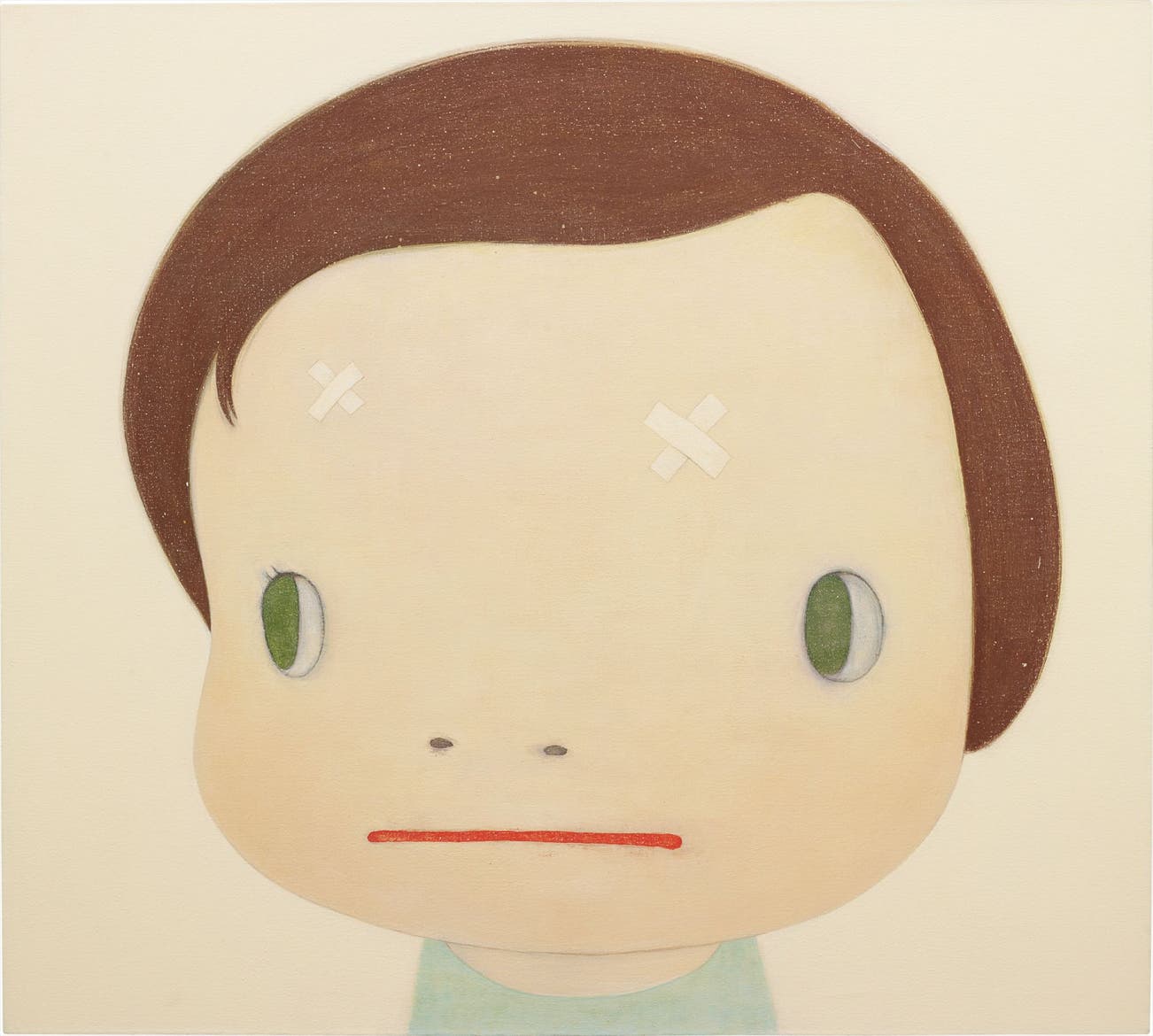 But we would be remiss to only pay attention to the alluring cuteness of Nara’s palette, for, upon his child’s broad forehead, sit two x-shaped bandages, clearly a consequence of a bit of more violent play, or perhaps even aggression. Furthermore, as if to signal his residual guilt, the child’s eyes are cast askew, unwilling to make contact with the observer’s as a byproduct of his shame. These bandages, the guilty mug, and, of course, Nara’s title, clue us in to the mischief that the child has engaged in most willingly, in pursuit of exploring the world both physically and emotionally to a never-ending degree.