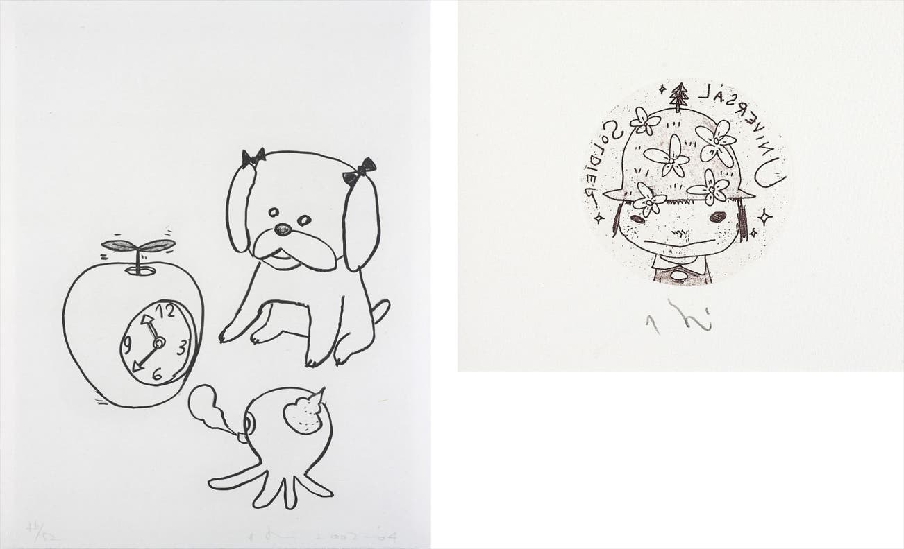Time Goes On signed, dated '2002-04' and numbered 46/52 in pencil, published by KIDO Press, Inc., Tokyo (with their blindstamp), Universal Soldier signed in pencil, an unnumbered impression from the edition of 400 printed for the calendar of the Department of Painting and Printmaking, Tokyo University of the Arts, both unframed.