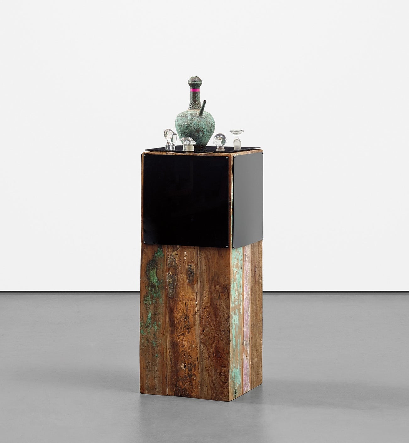 copper jug, tape, glass, Plexiglas and paint on teak wood