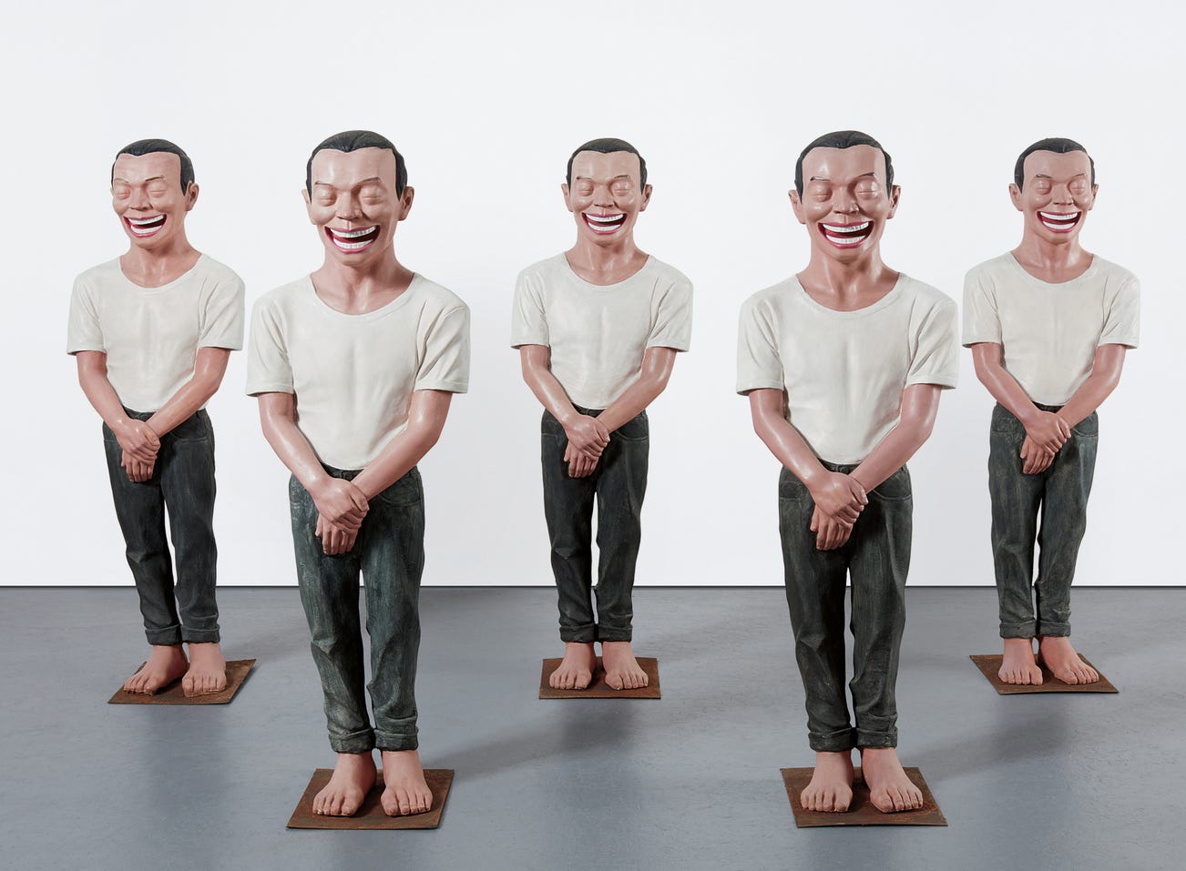 each signed and dated "yue minjun 2000" and numbered "3-1", "3-4", "3-8", "3-12" and "3-17" respectively on the reverse