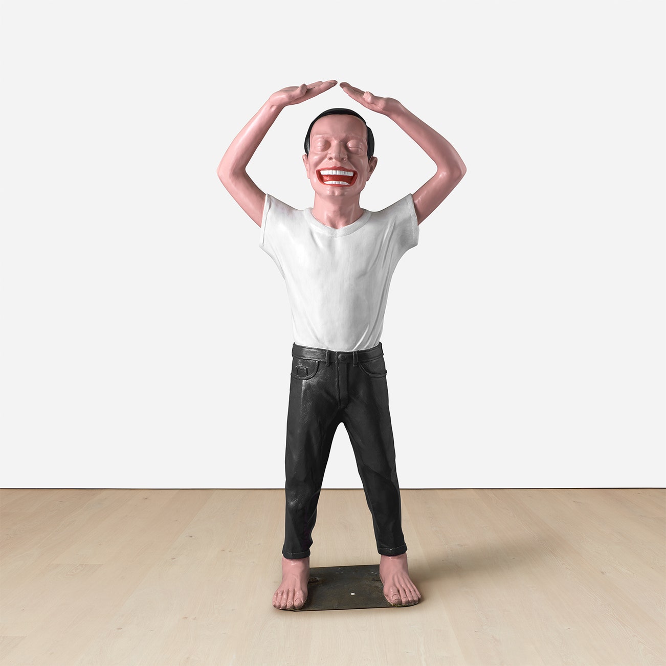 As part of 5 unique sets of sculptures that the artist created, the present lot is part of the group entitled Contemporary Terracotta Warriors No. 5. Yue Minjun created five of these sets of unique sculptures, each comprising 25 warriors with a different stylistic rendering of the arms: some with their arms crossed in front of their bodies, some with their hands over their ears and, in this instance, with their arms raised. The artist wittily injects contemporaneity through his reinterpretation of the historical terracotta warriors found in the tomb of Qin Shi Huangdi, one of China’s most influential emperors. Yue Minjun creates each of his warriors to be identical in order not to exhibit individualism, boldly critiquing the numbing similitude that plagues current society in the modern age.