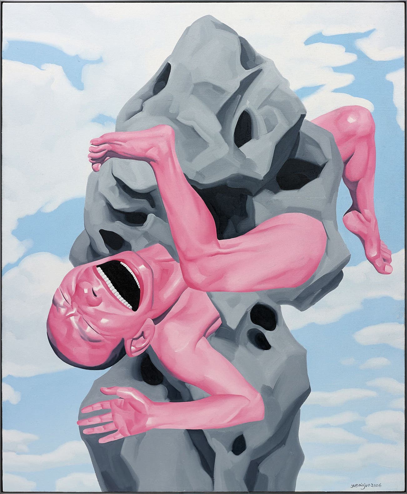Signed and dated 'Yue Minjun 2006' lower right. Further signed and dated 'Yue Minjun 2006' in Pinyin on the reverse.