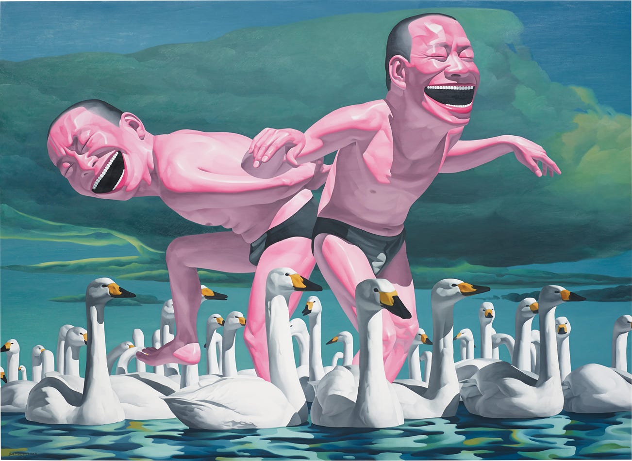 If this seems glib, an art straying from ‘the innocence of its roots’ also mirrors the crushed optimism of Yue and his Cynical Realist contemporaries after the 1989 Tiananmen Square massacre: an event that saw artist Sheng Qi sever his own finger in protest. Here we see two of Yue’s figures aping the poses of swans, while the birds themselves float impassive and eerily static, like factory-made rubber ducks. From a series titled Free and at Leisure, the image invites us to wonder how ‘free’ the performers really are. Their body language is a paroxysm of joyful abandonment: their beaming faces are stark voids. The allusive dance remains oddly human in its absence of humanity, and is shot through with a sense of haunting melancholy.