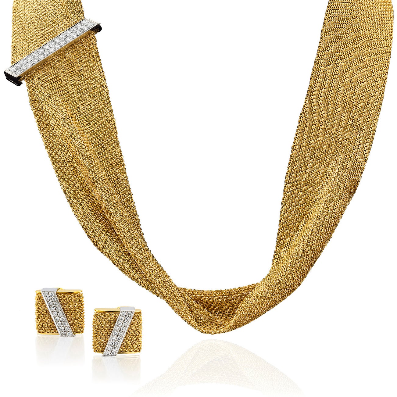 18K yellow gold and platinum, necklace length approximately 25 inches, earclips approximately 3/4 x 13/16 inch each