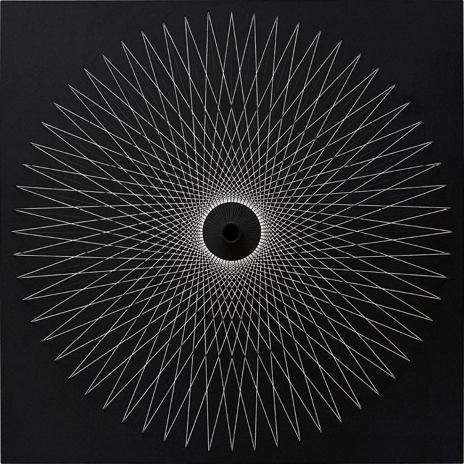 Kinetic relief sculpture, with screenprint in white on a painted black wooden panel, with metal tube and elasticated string,