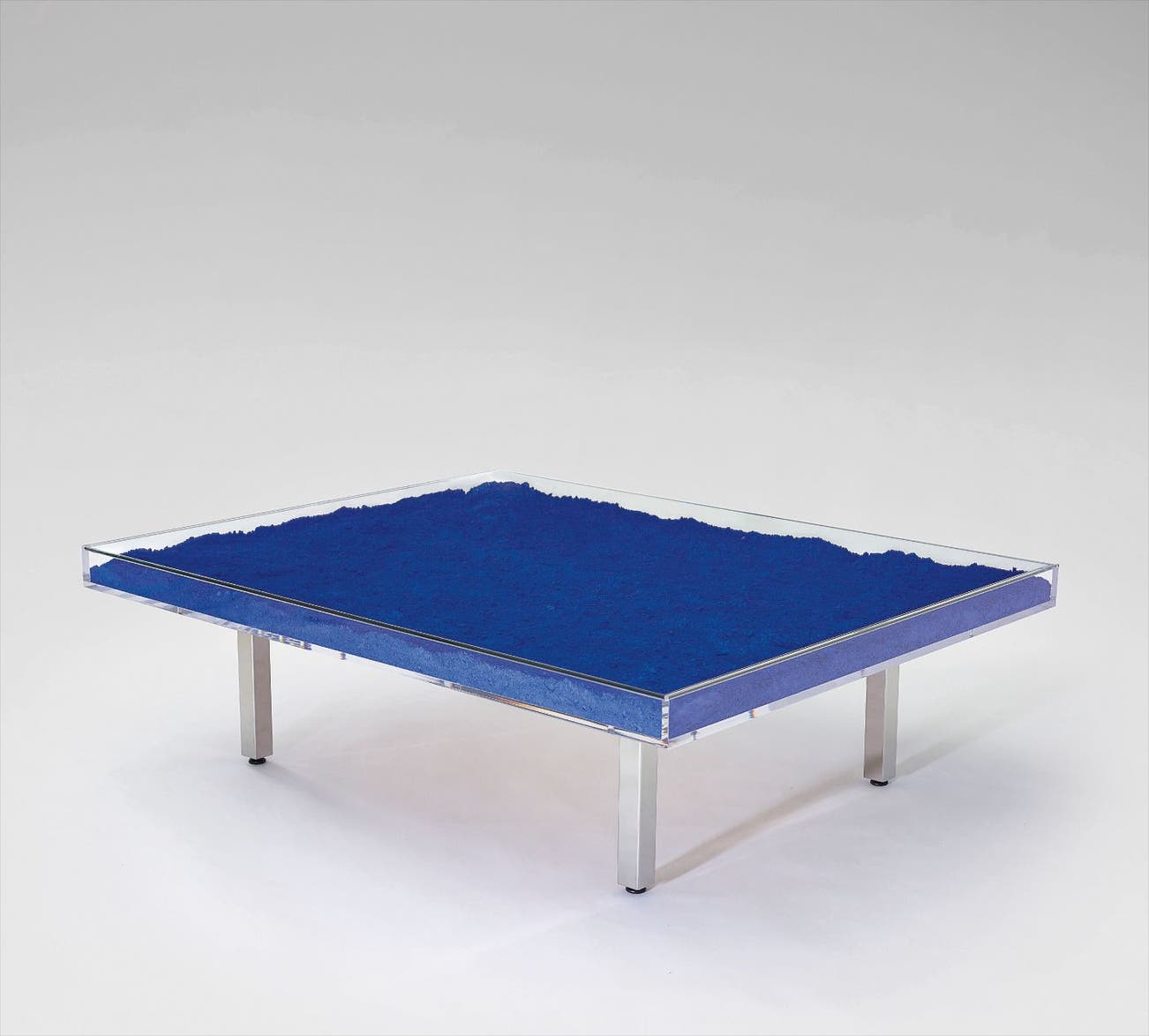 Acrylic, glass, International Klein Blue pigment, chromium-plated metal.