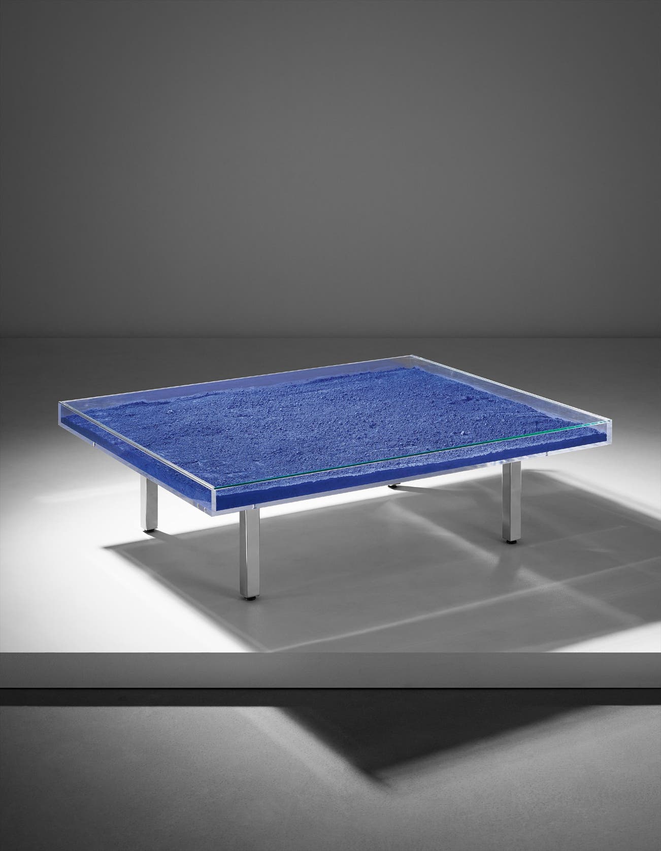 Acrylic, glass, IKB pigment, chromium-plated metal.