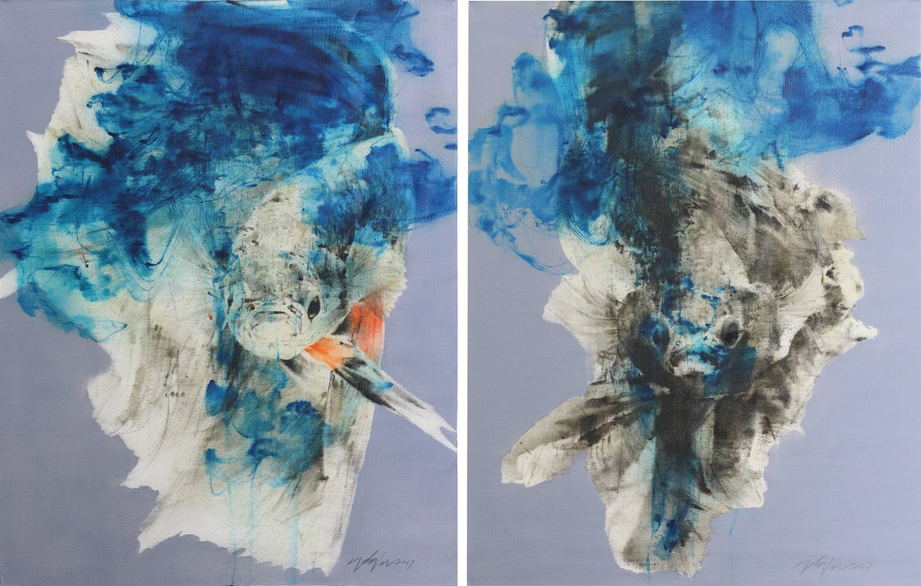 Zac Lee (b. 1968, Malaysia) is one of the most established fine artists in Malaysia, known for presenting incisive social commentary through sublime works in which abstract objects and forms are metaphors for individuals and the community. Twins features his trademark fluid brushstrokes and demonstrates Lee's deft application of his training in Chinese calligraphy and watercolour painting.