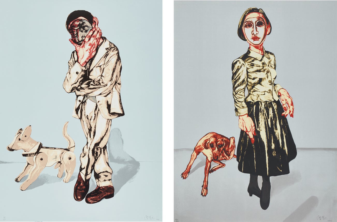Mask Series: two plates (Man and Dog; and Woman and Dog)