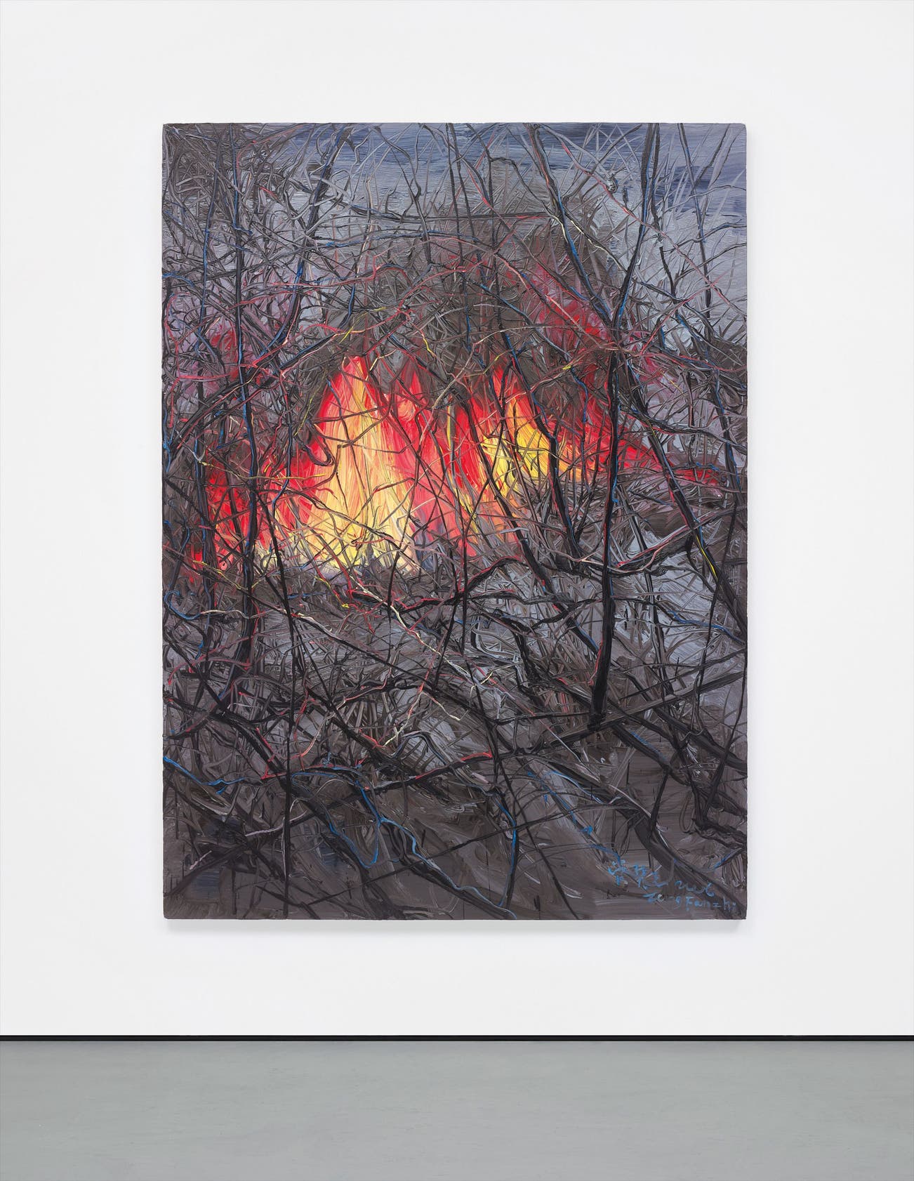 A sense of mystery dwells within Zeng Fanzhi’s abstract landscapes of often desolate, dark and intensely lonely compositions. The foreground is dominated by an array of chaotic branches and thorns; this organic matter denies a simple reading of this piece as we attempt to pick our way through the dense, interlocking undergrowth. In the present lot, Landscape (Flames), 2006, what lurks behind the bristles is a brimming fire of red, pink and yellow hues, casting a golden light over the thorny branches. Fire gives and takes life in almost equal measure, symbolising a welcome respite from the enclosing night or a nearing danger. Zeng refuses to choose, abandoning the viewer in a realm of uncertain anxiety as we peer into the scene from our hiding place.