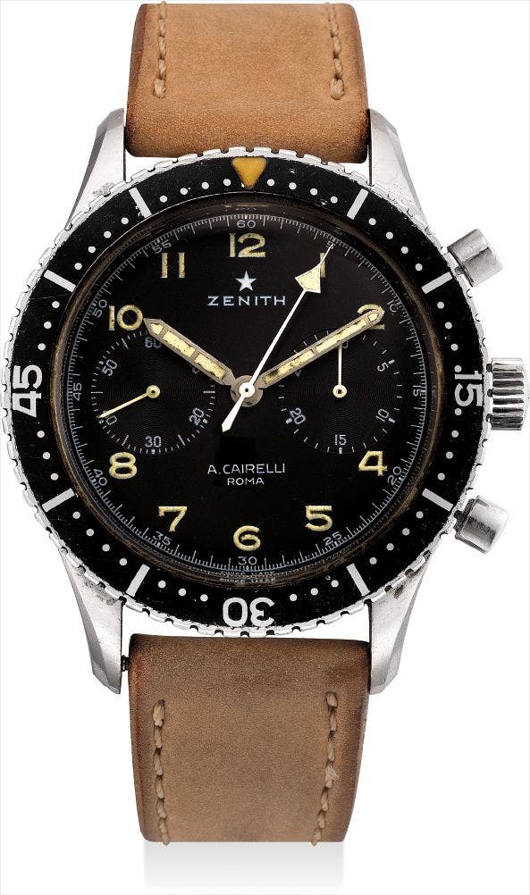 The watches were supplied through A. Carielli, the prominent Roman retailer. The present watch is a rare military issued version, which is illustrated by the engravings on the case back, reading 'A.M.I. Cronometro Tipo CP-2 M.M 202 129'.