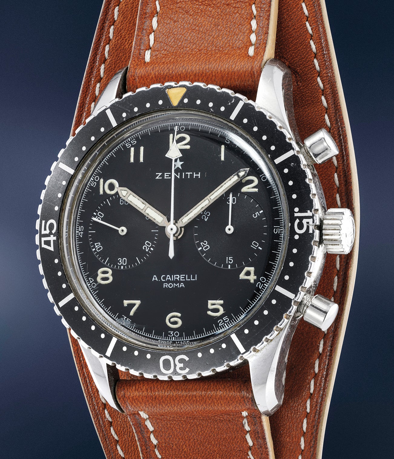 With its large 43mm. case size, black dial with large Arabic numerals and military background, not to mention its overall good looks, the Zenith "A. Cairelli" Tipo CP-2 (Cronometro da Polsa Tipo 2 meaning wristwatch type 2) has become a highly coveted chronograph.