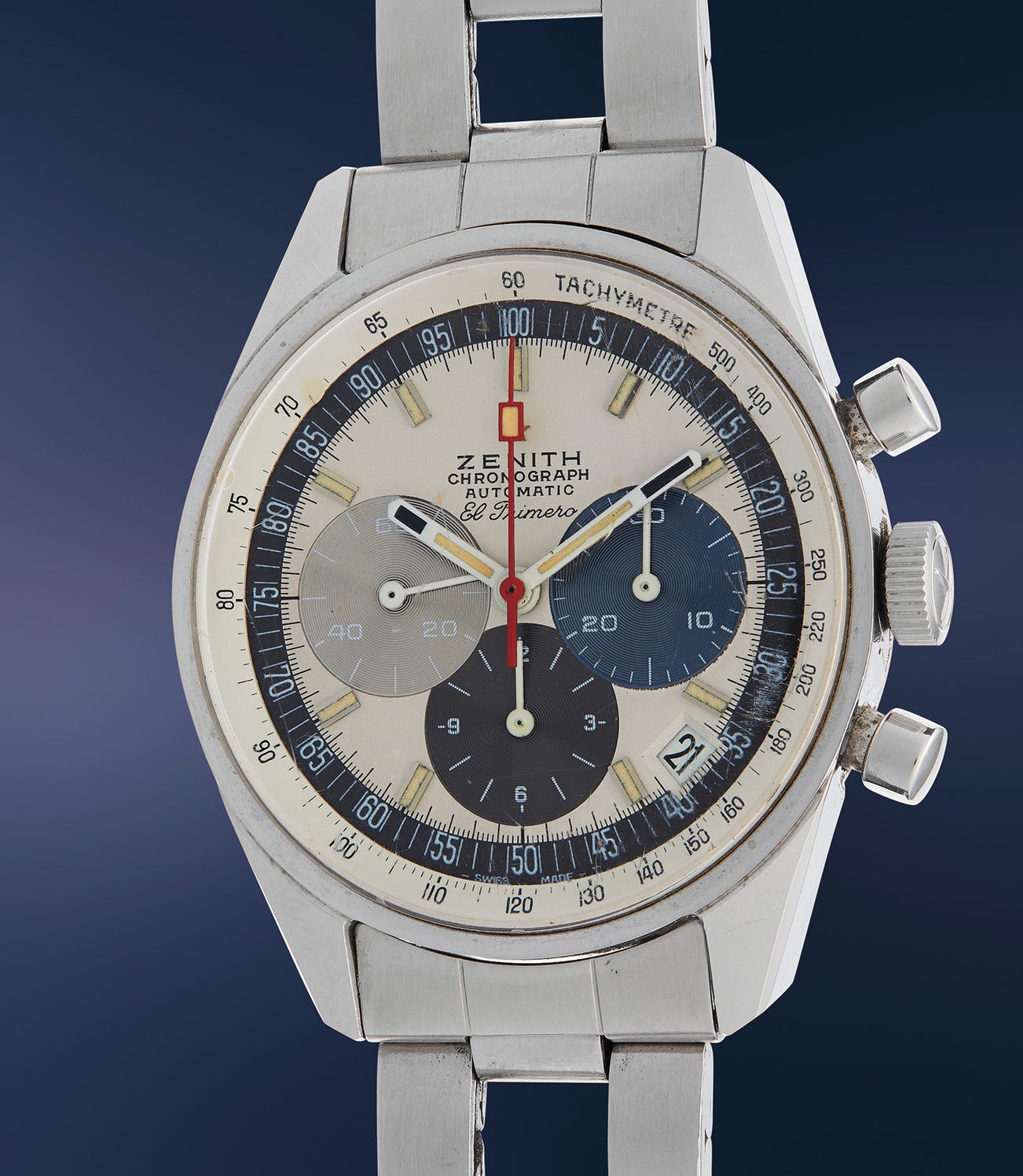With the El Primero, Zenith created a new aesthetic with a dial that featured a combination of colors with subsidiary dials in blue, light grey, and anthracite. The hour and minute hands were in white enamel with black tips, while the chronograph hand was in red enamel. This created a modern and colorful new look for sports watches, and a move away from the more subdued aesthetics of the 1940s and 50s.