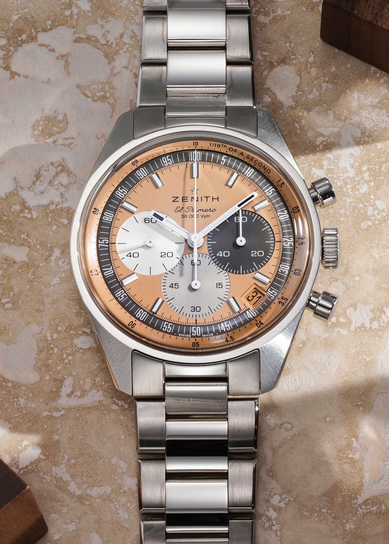- Featuring a stunning and warm matte salmon opaline dial, the dial is further given balance with three interlocking galvanic sub-dials in harmonious tones of grey and silver. Similarly, the galvanic grey shade from the three o'clock subdial has further been used for the surrounding 10-second tachymeter scale, whilst a corresponding salmon base has been used for the surrounding 1/10th of a second scale.