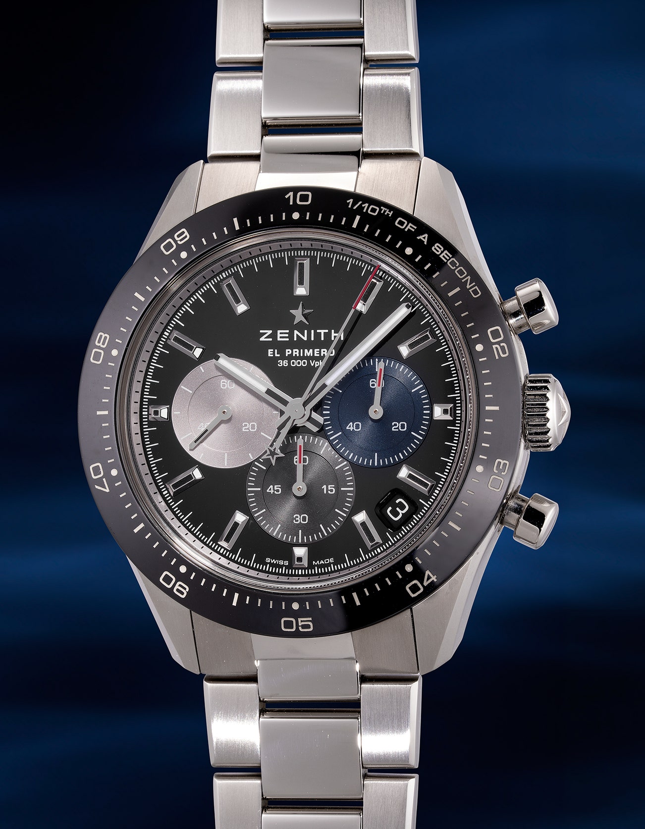 - Sized at 41mm and cased in stainless steel, the Zenith Chronomaster Sport features a tri-color dial that differentiates its overlapping registers clearly: 60-second, 60 minute and small seconds. The Zenith star logos can be spotted both on the chronograph counterbalance as well as the applied logo at 12 o’clock which is a nice sporty touch to the overall timepiece.