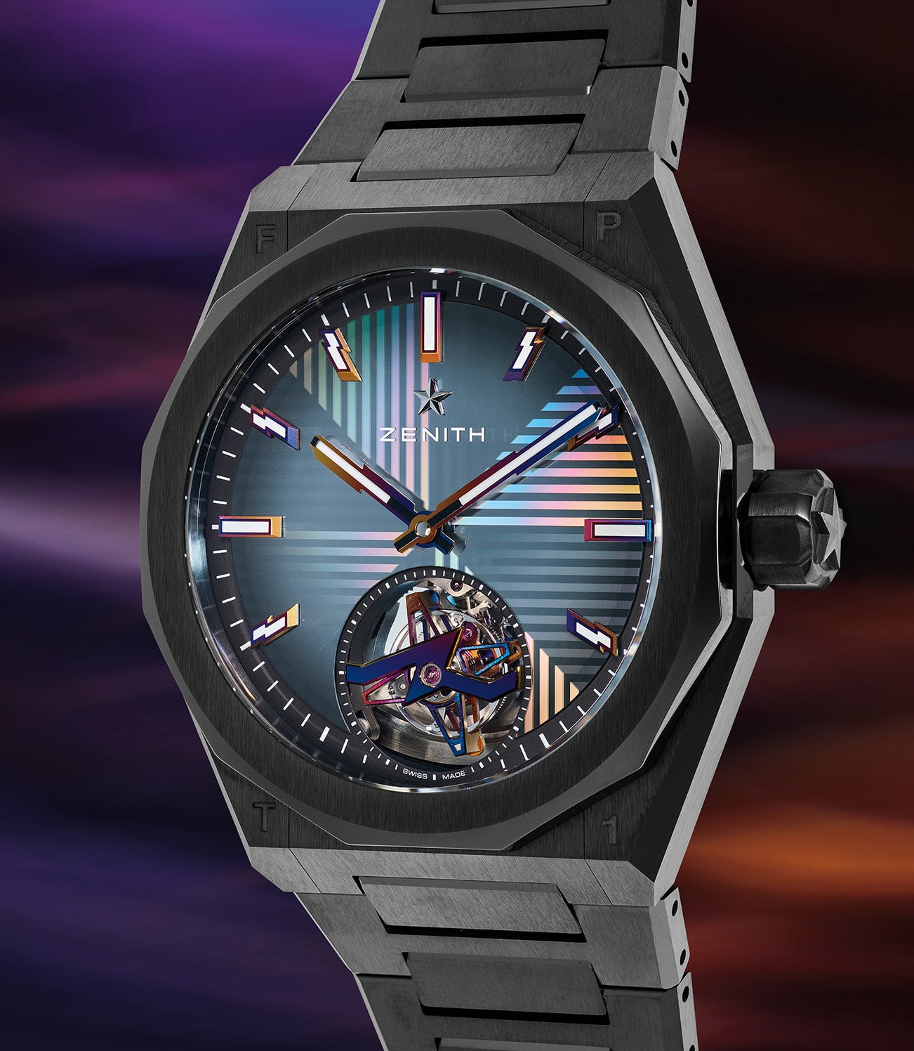On the latest chapter of the artist’s creative output with Zenith, Felipe Pantone shared: “I'm excited to unveil my latest collaboration with Zenith, our most exceptional watch to date. It's a masterpiece of high horology, combining simplicity and sophistication. This complex yet minimalist timepiece features stunning details, including the tiny gradient indexes and hands, the mirror ‘Planned Iridescence’ dial, and a truly unique bolt-shaped tourbillon.”