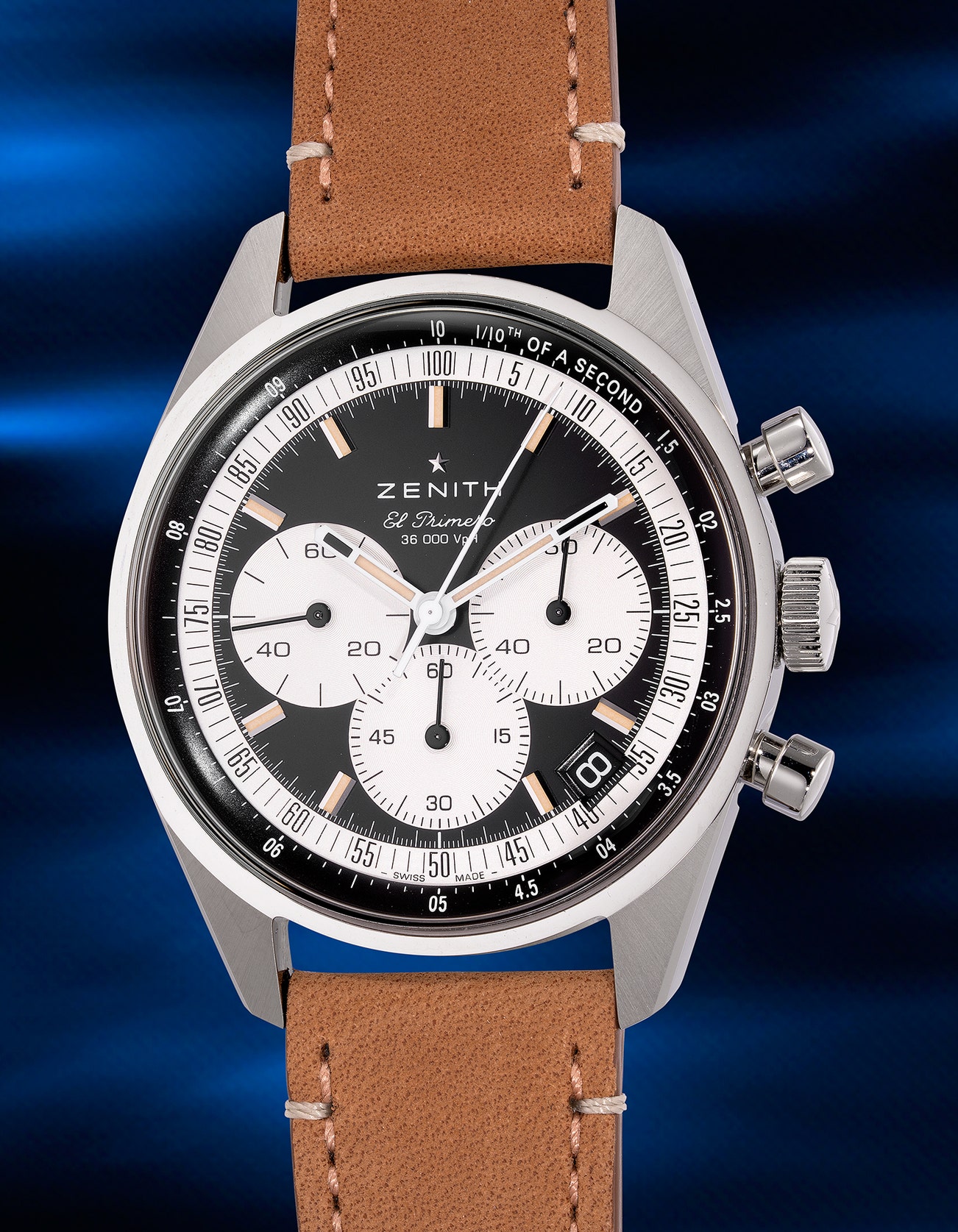 - This particular reference is powered by the renowned high-frequency El Primero calibre 3600. It features a 1/10th of a second chronograph display, offering immense joy as the central chronograph hand sweeps smoothly across the matte black reverse panda dial. The luminous material is intentionally designed in a slight ivory hue, enhancing the vintage appeal of the watch.