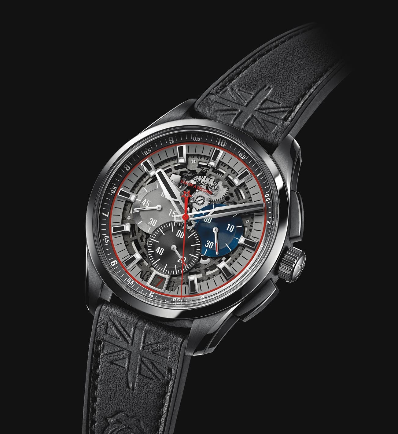 The openworked dial centre provides a clear view of the movement. On the caseback side, the oscillating weight visible through the transparent crystal is adorned with the British rock band’s famous “red tongue” logo. The date numerals arranged on a ring around the dial circumference appear in a window at 6 o’clock. The chronograph counters reprise the emblematic colours of the original El Primero chronograph and the red central sweep-seconds hands is fitted with a tiny star-shaped counterpoise. The hours and minutes hand are shaped like the fretboard of the Fender Telecaster guitar used (and made legendary) by Keith Richards, one of the key members of The Rolling Stones. The light titanium case features openworked lugs and the rubber strap features a Barenia calfskin insert that is tone-on-tune heat-embossed with the group logo and the Union Jack. The watch comes in a presentation box bearing the group logo as well as that of Zenith.