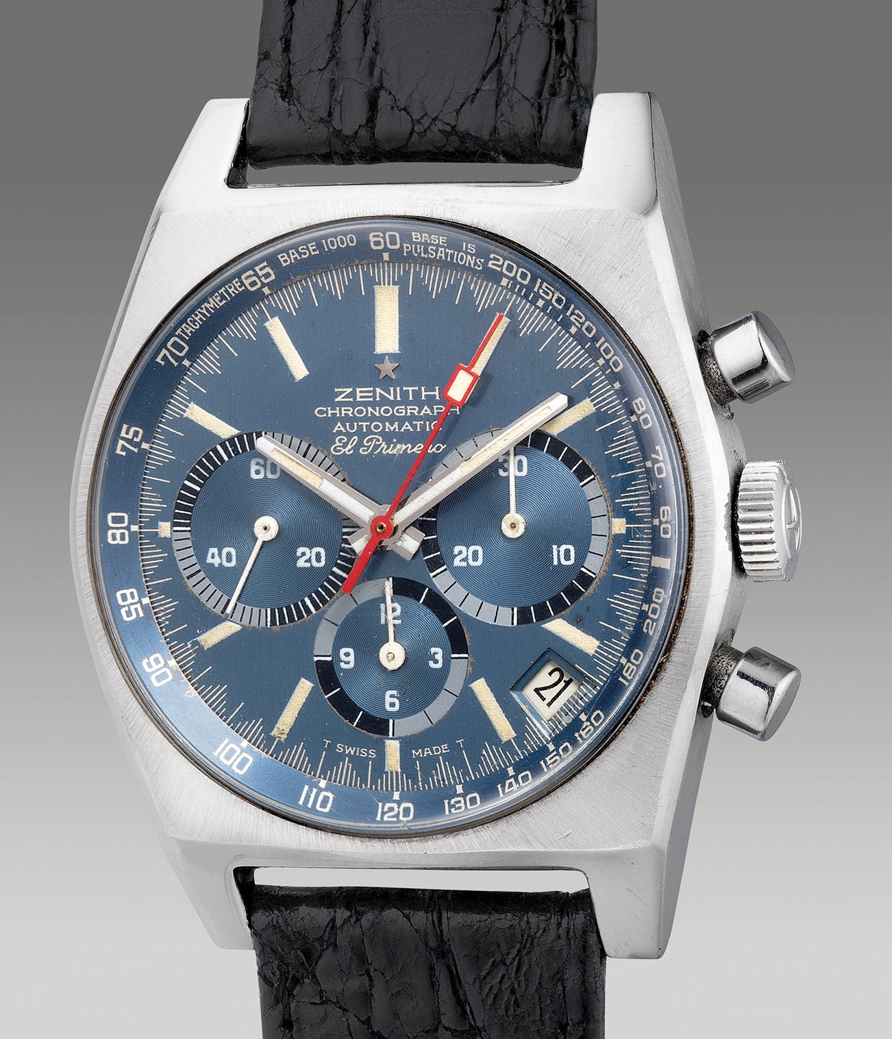 The present Zenith El Primero ref. A3818 from circa 1970s is one of the early models that was produced by the firm before the production came to a halt. Regarded as one of the rarest El Primero references, it is believed that only 1,000 examples were produced. The present example features a mesmerizing blue dial with tachometer and pulsation scales, which is always a plus to witness on the dial of chronograph wristwatches. Furthermore, stamped “SP” inside caseback, the case is made by renowned casemaker Spillman. Presented in attractive overall condition, this present A3818 is certainly one not to miss for aficionados of chronograph timepieces.