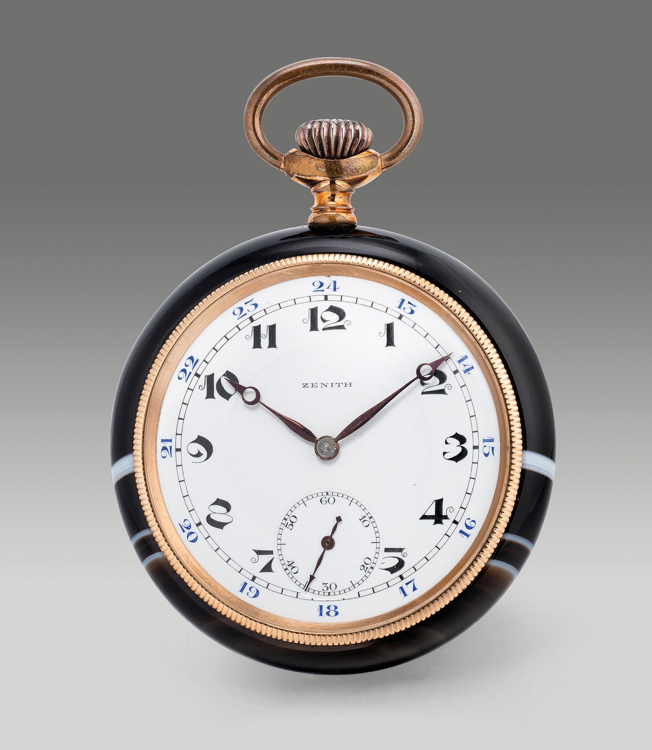 The present open face pocket watch is a wonderful representation of the exact designs produced by Zenith at the turn of the century. Agate is formed primarily from volcanic and metamorphic rock, consisting mainly of quartz and chalcedony. Due to its durability, hardness, and ability to retain a highly polished surface the stone has been used as an ornament dating back to the ancient Greeks. The watch case back is produced from a single piece of Agate with brownish to black tones and highlighted by white strips with a reeded bezel. The white enamel dial is enhanced with outer 24-hour indication. The watch is in lovely condition, and an example of the innovative watch design a century ago.