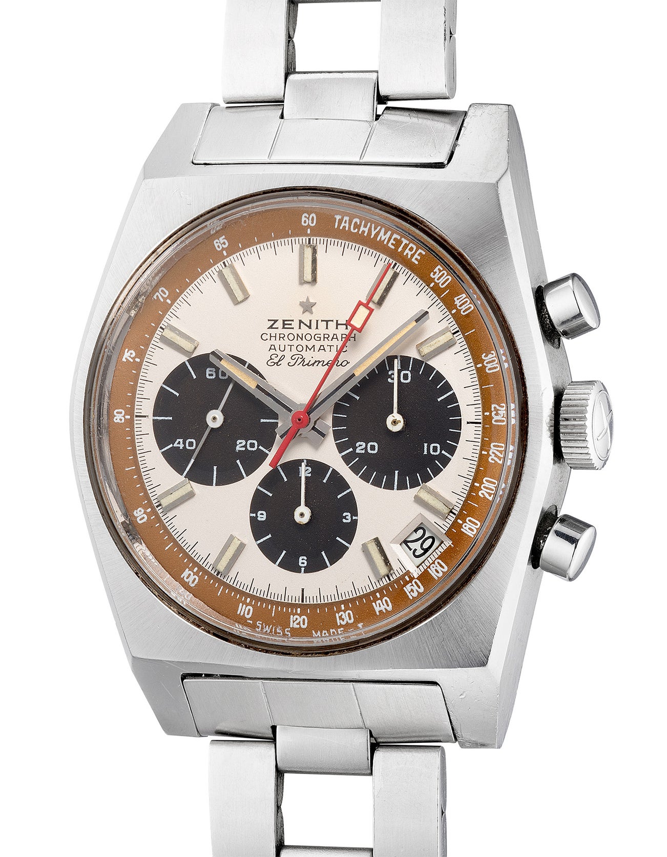 Extremely rare, early examples of the Zenith El Primero were referenced A384. With only 2,600 examples ever produced, the A384 is one of the most highly sought after Zenith El Primero models. The present example in stainless steel is offered in attractive overall condition as is further enticed with a beautiful tropicalization of the outer track due to ageing turning the originally black section brown. Furthermore, the present example is fitted with a rare and original Gay Frères ladder bracelet which is stamped “PAT.PEND.” on the extension link. Superbly attractive boasting an unpolished case, the present example is a must-have for collectors of vintage chronographs.