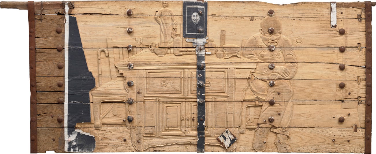 Memory Door (Miss) is a commanding example from Zhang Huan’s 2006 series entitled Memory Doors in which the artist collected doors from country houses in Shanxi Province that were being torn down or renovated in favour of a new, Western style. Huan used the Chinese tradition of pasting gods or deities to bring luck and fortune, now incorporating three different themes: military, day labor and daily life. Huan’s pasted photographs were partially carved away into bas-reliefs that in turn interacted with the surviving measures of the photographs. Merging traditions and skills of the past with innovative artistic devises, Huan employed Chinese artisans instead of artists to help complete the carvings, simultaneously keeping traditional Chinese craftsmanship alive, whilst creating an innovative outlets and practices for their specialist skills.