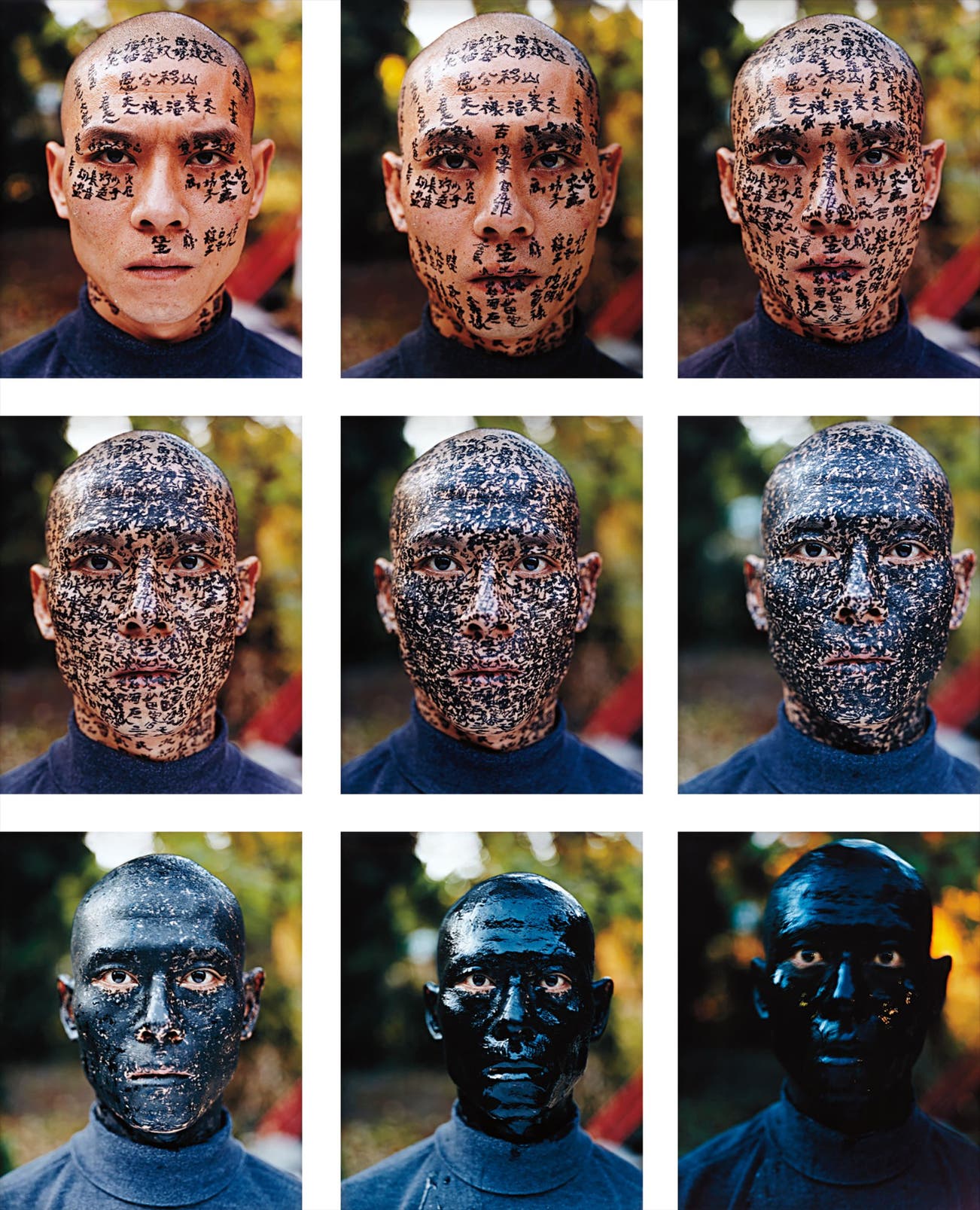 In Zhang Huan’s Family Tree viewers find a deeply intimate and cultural exploration of heritage and selfhood that is in keeping with the artist’s penchant for performance. The grid documents the progression of three calligraphers whom the artist had invited to write text on his face over the course of a single day. The sources inscribed on Zhang’s face include popular Chinese folklore, family names and poems. As such, the artist transformed the human face from a marker of individuality to a vessel of collective history. Some of the text on Zhang’s face relates to studies of human physiognomy, whereby individual facial features alluded to personality attributes. Yet, the irony in Zhang’s work is that the layering of informative text on his face subsequently hides it. Taken two years after the artist had left his native China for New York, Family Tree is a candid exploration of one’s background and the potential complexities that could follow. To understand one’s unique self, Zhang informs the viewers, is to understand the endless confluence of social and cultural forces that had come to create it.