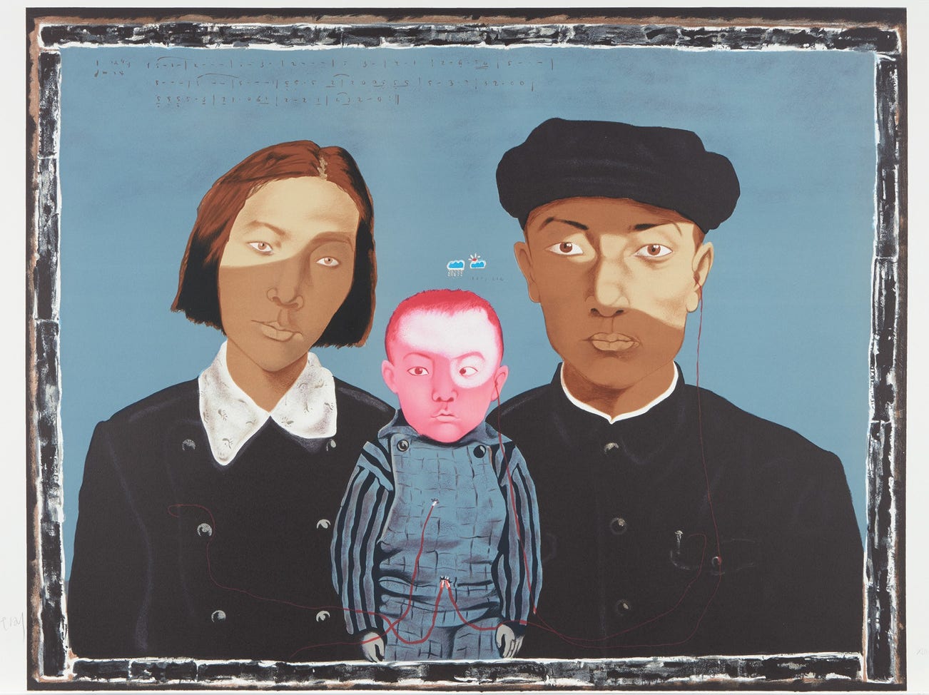 Xiaogang investigates how to express individual histories within the strict confines of a formula. His sitters, while appearing muted and compliant, are given physical exaggerations: oversized heads, tiny hands and long noses. These distortions imply stifled emotions and give a complex psychological dimension to the artist's work.