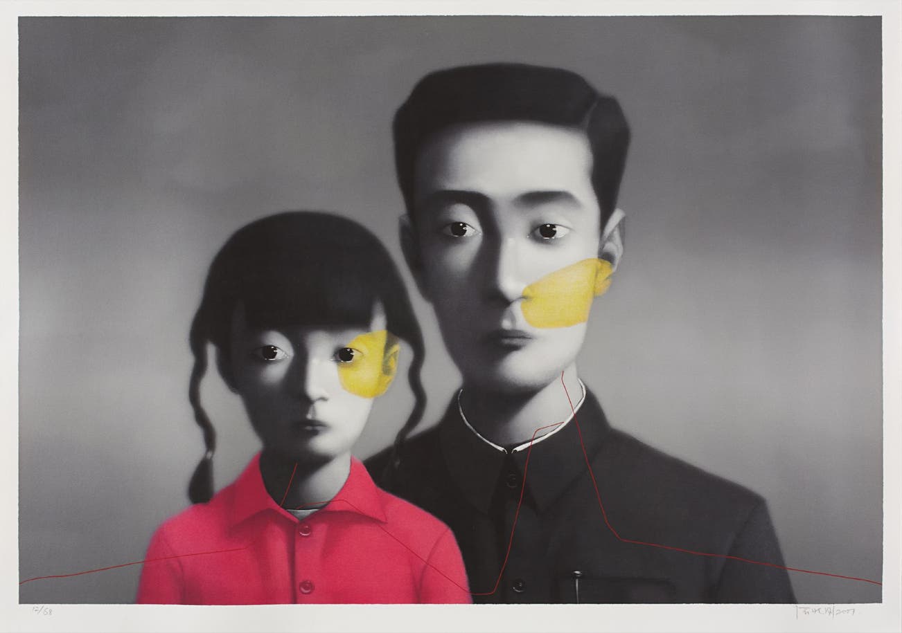 Xiaogang investigates how to express individual histories within the strict confines of a formula. His sitters, while appearing muted and compliant, are given physical exaggerations: oversized heads, tiny hands and long noses. These distortions imply stifled emotions and give a complex psychological dimension to the artist's work.