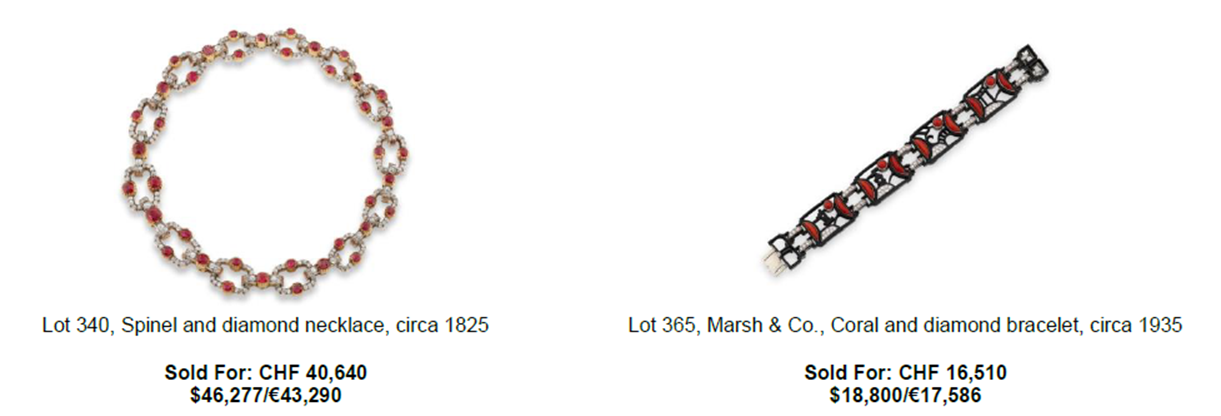 Pieces with remarkable provenance were highly sought-after, including a Natural pearl and diamond necklace, from a European noble family, which sold for over four times its presale low estimate, achieving CHF 267,000 / US$ 303,000. A Spinel and diamond necklace gifted by King George IV to his mistress the Marchioness Conygham, sold for CHF 41,000 / US$ 46,000, more than three times its presale low estimate, and a Coral and diamond bracelet by Marsh & Co, formerly in the collection of Margaret Roebling Perrine and later Fred Leighton, sold for over CHF 16,000 / US$ 19,000.
