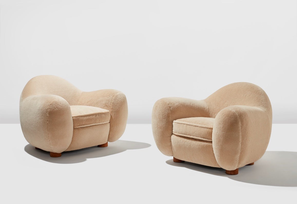 A stunning pair of "Boule" armchairs, also known as "Ours polaire," by Jean Royère, is set to headline the upcoming Design sale. These iconic pieces, drawn from a private collection, embody the pinnacle of 20th-century blue-chip design with their signature curves and luxurious forms that define Royère's timeless aesthetic. Introduced in 1942 at the Salon des Artistes Décorateurs—where Royère famously designed an entire living room around the form—the "Boule" quickly became a cornerstone of his oeuvre, appearing in many of his later interiors. The pair of armchairs on offer achieved $482,500 at Phillips in 2009, far surpassing its $200,000–250,000 estimate. Now, fifteen years later, with an estimated value of $600,000–800,000, they reflect the remarkable ascent of Royère’s market.