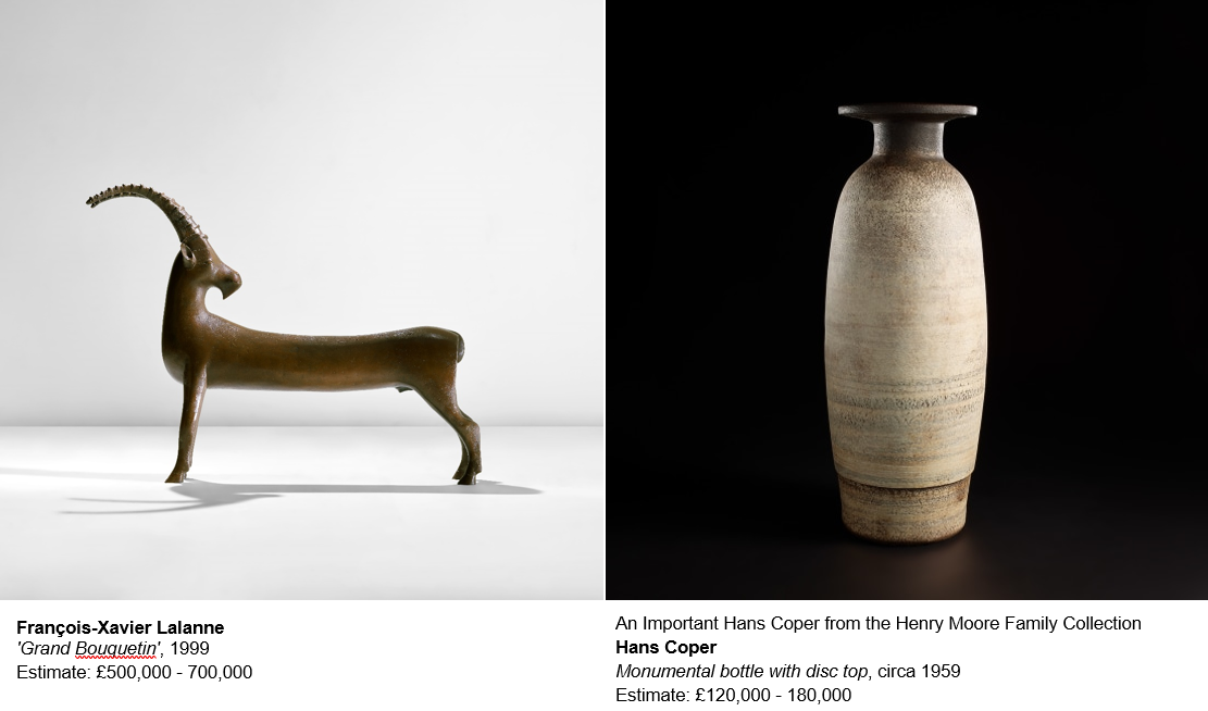 Leading the sale are two lots by François-Xavier Lalanne; his 1999 ‘Grand Bouquetin’, and his 1993 'Mouton de Pierre' and 'Mouton Transhumant'. François-Xavier and his wife and fellow artist Claude had a very dynamic approach to combining decorative and fine arts. Known collectively as ‘Les Lalanne’, they were inspired by nature, flora, and fauna and are regarded as having revolutionised design in the 20th century. During his career François-Xavier took up the challenge of sculpting many different animal forms, resulting in a fantastic menagerie of creatures that bridge art and design. None are more celebrated than the artist’s beloved mountain goat 'Grand Bouquetin' and his regal sheep ‘Moutons’, both of which were integral to the designer’s fantastical bestiary. These elegant creatures are magnificent examples of the artist’s love for illustrating the animal kingdom.
