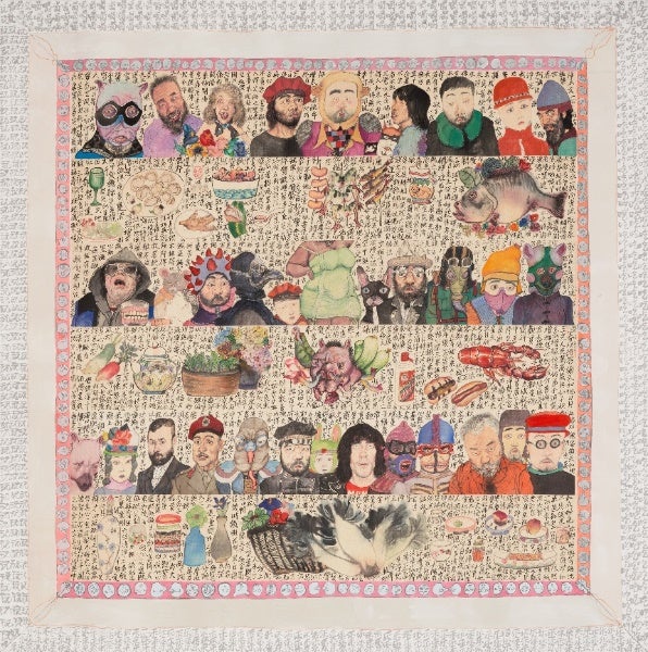 Li Jin is widely known for depicting themes of food and sensuality in contemporary life, using bright and rich colors with delicate brushwork. One of the highlights of this exhibition is The Heart Sutra, which took nearly a year to create and depicts a whimsical banquet scene. At the center of the painting is a voluptuous female body, a recurring theme in Li Jin's works, representing humanity's inescapable physical nature and innate desires. Surrounding the scene are various characters, including the German social theorist Max Weber, Sean Connery as James Bond from the film '007,' and a diverse array of ordinary people Li Jin encountered on the streets of Osaka, New York, and Berlin. There are also masked people and animals, as well as at least eight self-portraits of the artist himself, each embodying different roles, such as a Norman soldier, an Elizabethan merchant, a Brooklyn hippie, a drunken skiing accident victim, a disgruntled artist, and an Edwardian chauffeur. Displayed in the banquet are endless delicacies and fine wines from different countries. Interspersed among the indulgence in food and drink are texts from Buddhist scriptures and chants. Reciting or copying these texts, as Li Jin does, is a process of repentance, accumulating merit to offset the obsessions and sins of life.