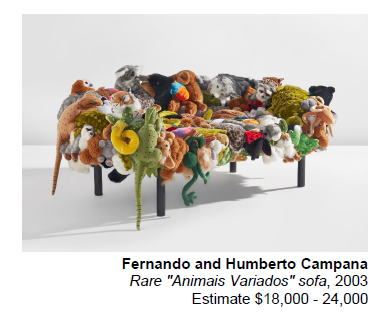 A rare "Animais Variados" sofa by the Campana Brothers, well known for their editioned seating designs of upholstered stuffed animals, is another auction highlight. This unique piece, designed for the Sao Paulo-based theatre company Companhia Delas de Teatro’s 2003 production of the