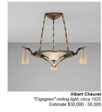 The sale also features a selection of French designs spanning from the Art Deco to the Post-War period. Highlights are two works by Art Deco master Albert Cheuret, renowned for his lighting designs and smaller furniture pieces adorned with exotic bird imagery. The ceiling light and pair of illuminated mirrors showcase Cheuret's signature “cigogne” (stork) motif. The sale also showcases Modernist designs that reflect a shift from the decorative styles of the 1920s towards more simplified and