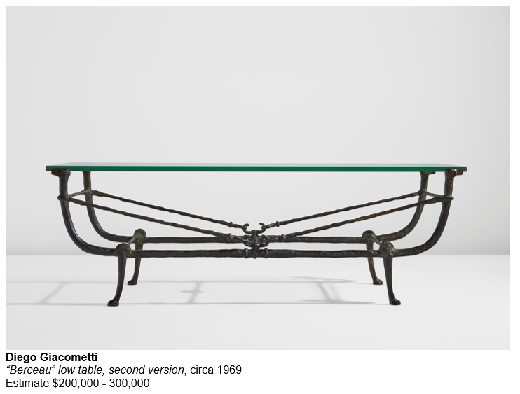 The auction features five important works from the estate of Diana Shapiro, including Diego Giacometti’s “Berceau” low table, second version, Tabouret à la harpie, and Cheval, tête baissée as well as Alberto Giacometti’s "Figure" floor lamp and "Étoile" table lamp. These pieces were acquired directly from Diego Giacometti in the late 1960s and into the early 1980s by Diana and Irvin Shapiro, who would go on to be long-time friends of the artist, with Giacometti’s works being kept in the same New York City apartment decades beyond their original creation. These pieces demonstrate the artists’ mastery in creating timeless, functional art, with exquisite craftsmanship and whimsical elements making them highly sought after in the market.