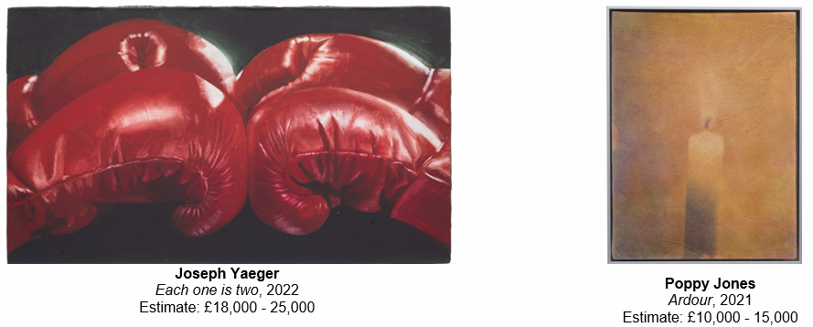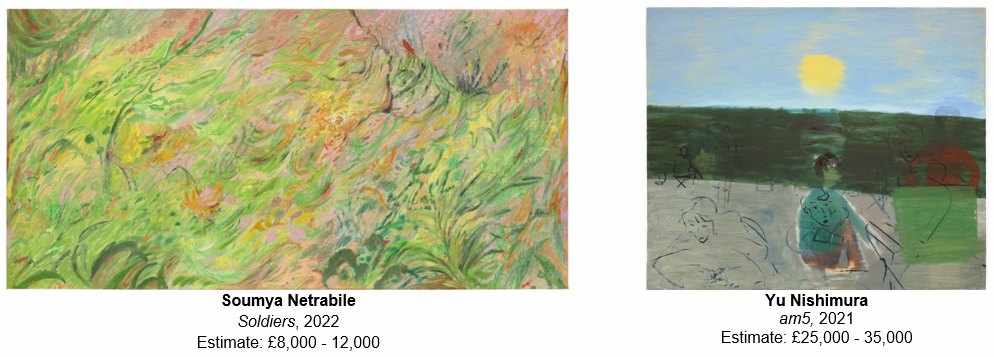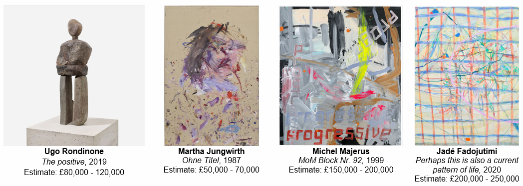 Additional sale highlights include works by Ugo Rondinone, Martha Jungwirth, Michel Majerus, Jadé Fadojutimi, Soumya Netrabile, Yu Nishimura, Joseph Yaeger, and Poppy Jones.