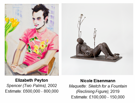 Another standout highlight of the sale is Nicole Eisenman’s Maquette: Sketch for a Fountain (Reclining Figure). This playful yet poignant bronze sculpture distills the artist’s distinctive blend of humour and social critique, reimagining classical forms through a contemporary lens to challenge norms of beauty, gender and public space.