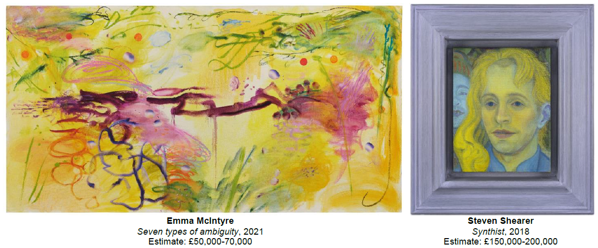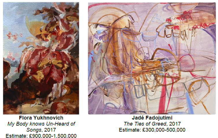British Female Painters The Evening Sale presents two works by established British contemporary artists, Flora Yukhnovich and Jadé Fadojutimi. Yukhnovich’s My Body knows Un-Heard of Songs draws inspiration from Jean-Honoré Fragonard’s The Swing and is an important early example of her signature fusion of Rococo aesthetics with contemporary abstraction. Fadojutimi’s The Ties of Greed, executed in the same year, showcases the artist’s mastery of layered colour and energetic linework. Created during Fadojutimi’s MA studies at the Royal College of Art, it reflects a defining moment in her practice.