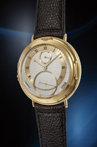 A unique, historically important double sided yellow gold wristwatch with power reserve, day and date
