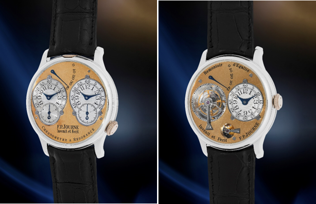 F.P.Journe, Resonance “Pre-Souscription”, Numbered 43/00R, an early, extremely well-preserved, and important platinum wristwatch, “shiny” yellow gold dial, guarantee, and presentation box, circa 2000 Estimate: $500,000 to $1,000,000
