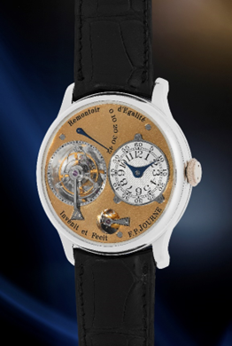 F.P.Journe, Tourbillon Souverain, Numbered 43/99T, a sublime, extremely well-preserved, and important platinum tourbillon wristwatch with remontoire d’egalité, “shiny” yellow gold dial, guarantee, and presentation box, circa 1999 Estimate: $500,000 to $1,000,000