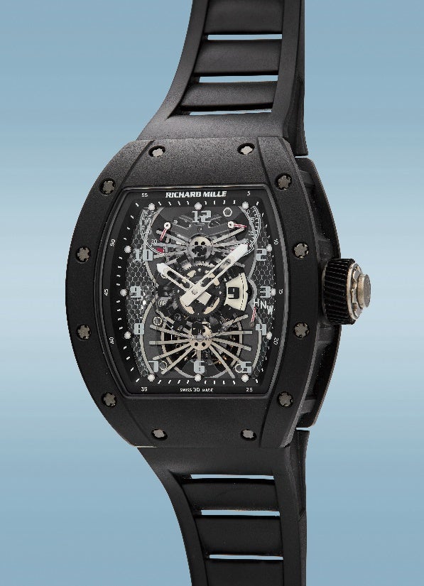 Richard Mille launched his first watch in 2001 and has since remained true to three key concepts, which helped redefine modern horology: the best technical innovations, the best artistry and architecture, combined with the best traditional watchmaking craftsmanship. Two industries influencing his designs were motorsports and the aerospace industry. This extremely rare RM022 manually-wound dual time tourbillon is a feat of engineering and technology with a case created from carbon nanotubes injected in to a black polymer. The result is an extremely durable material 200 times stronger than steel, while at the same time being very light. The dial is futuristic as well, made from a new alloy, orthorhombic titanium alluminides, which has been formed into a honeycomb structure. The material was tested by NASA for use on supersonic aircraft wings due to its resistance to high temperatures and torsion. Produced in only five examples, Richard Mille’s RM022 is a sleek aerodynamic timepiece that showcases the brand’s drive to create 21st century wristwatches with a contemporary aesthetic. Phillips is proud to present this limited-edition model, with a case measuring slightly larger and with more presence than the standard RM022 model.