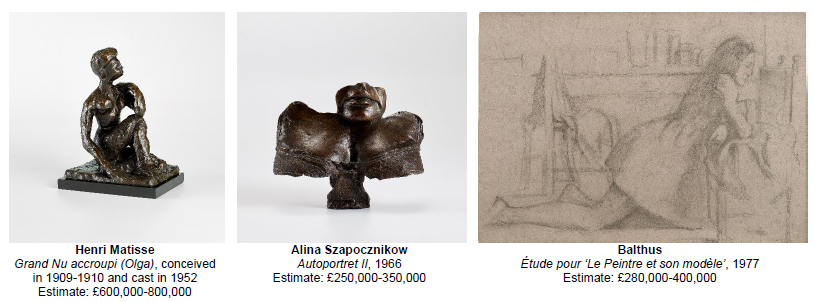 Examples of earlier 20th century masterworks include Henri Matisse’s Grand Nu accroupi (Olga), conceived in 1909-1910 and cast in 1952. This sculpture is one of a numbered edition of 10, with distinguished examples held in some of the world’s most prestigious private and institutional collections, including the Kunsthaus Zurich. The present work is a powerful example of Matisse’s skill and strength as a sculptor. The model, Olga Meerson, herself an accomplished artist, shared a profound artistic connection with Matisse, their creative exchange immortalised through their respective works. This is complemented by other examples of Post-War sculpture including Polish artist Alina Szapocznikow’s Autoportret II.