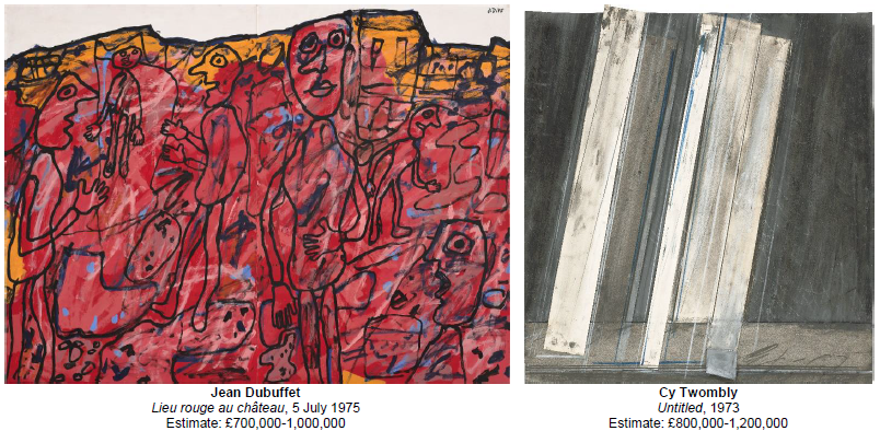 Other Modern Masters represented in the Evening Sale include Jean Dubuffet, with a spotlight on Lieu rouge au château. The Day Sale compliments this inclusion with three of Dubuffet’s late works, representing the shift towards abstraction in the later years of the artist’s life. These three works lead a group of ten lots coming from a Belgian private collection to be offered in the Day Sale.