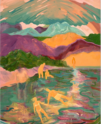 Young British female artists are represented throughout the sale. Moi aussi je déborde by Flora Yukhnovich is an energetic expression of her immediately recognisable blend of Rococo aesthetics and contemporary cultural references. Executed in 2017, the same year as her pivotal graduate show at City & Guilds London School of Art, Moi aussi je déborde captures an important early moment in the consolidation of her practice. Placing notions of femininity and questions surrounding female sexuality, pleasure, and the male gaze at its centre, Moi aussi je déborde belongs to a body of work concerned with reclaiming feminine excess and frivolity on strictly feminist terms. Testifying to the artist’s meteoric rise to critical acclaim, she just received a solo exhibition at Victoria Miro in London. Executed in dreamy washes of ochre, plum, and teal tones that seem at once tied to the cyclical patterns of the seasons, and to build a world that exists strangely outside of time, We Stray is a work of intense narrative power by young British artist Antonia Showering first presented as part of her online exhibition Introductions with White Cube in 2020. Depicting an idyllic mountain landscape with figures bathing and floating weightlessly across the still waters of a lake, We Stray brings together key elements of Showering’s practice, bridging the personal and the universal in its treatment of memory, time, and the deep emotional connections that we forge with both people and places.