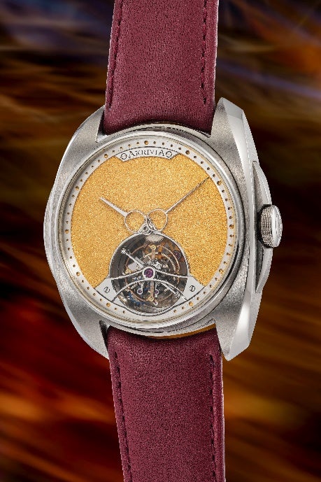 Another timepiece from the ateliers of Rexhep Rexhepi is the present Akrivia AK-05 Tourbillon Barrette Miroir in titanium. While his earlier models featured the combination of a tourbillon with another complication, the AK-05 was all about the tourbillon, featuring an extra-large cage and a blued escapement wheel. The yellow gold dial of the present watch has been meticulously hand hammered. The movement is as attractive as the dial, perfectly symmetrical with gorgeous Geneva stripes, mirror polished elements, and interior angles, it is an ode to beauty and craftsmanship. This AK-05 is the very first model to grace an international auction market. Bearing number 3, it is one of the earliest examples made.