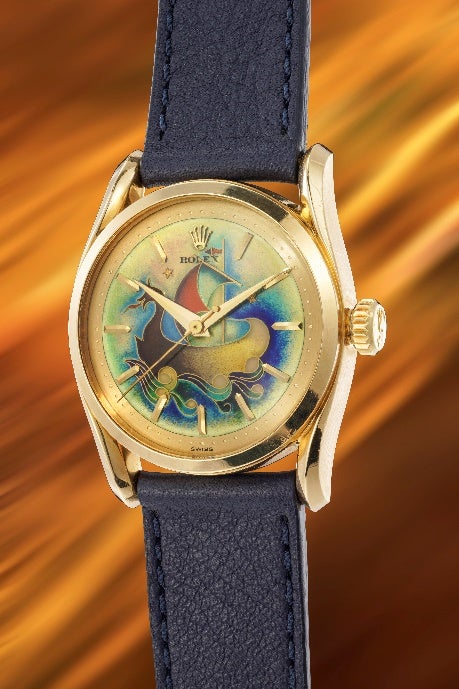 Cloisonné dials aren’t typically associated with Rolex, but ref. 6102 is an exceptional anomaly. The spectacular cloisonné enamel dial depicts a Caravel - a small, fast sailing ship of Spanish or Portuguese origin from the 15th to the 17th centuries. The dial was made by one of Geneva’s most acclaimed enamellers, Margueritte Koch, who worked with the Stern Frères company. The watch is furthermore preserved in exceptional condition.